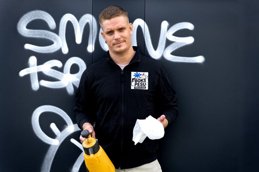 Saatiin Jaakko puhdistamaan viikonloppuna tulleet töhryt pois koulun seinästä. Tavoitettavissa!